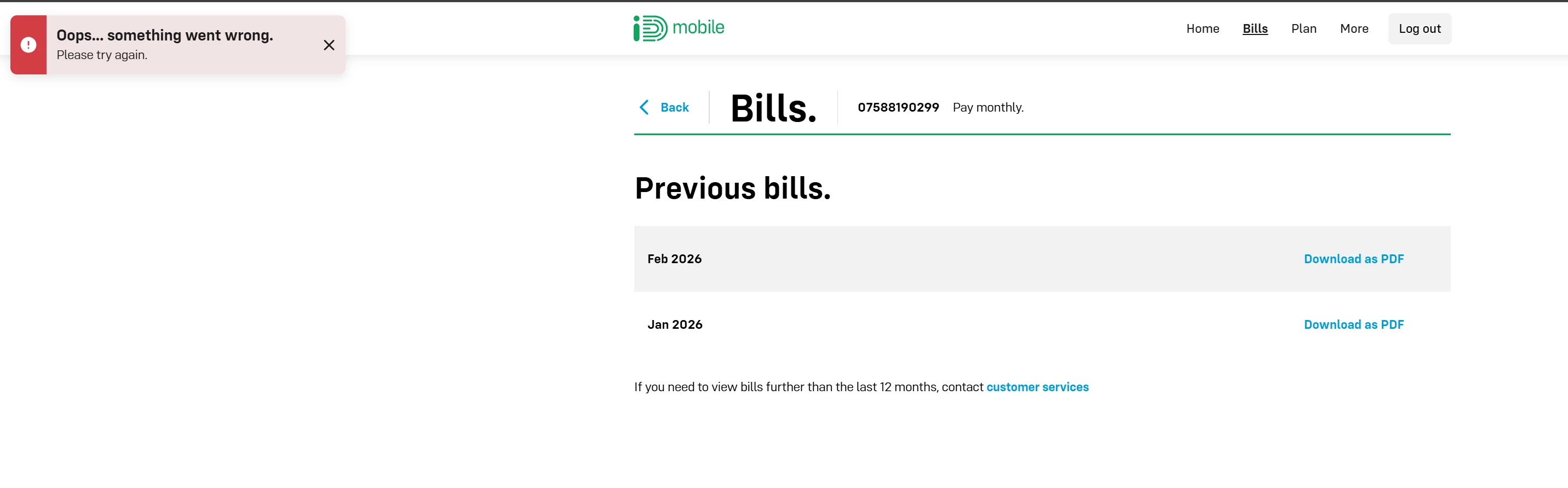 I cant access my latest bill (Feb2026) even though its visible on my app/website. it says "somethjng went wrong" and I cant view or download it.