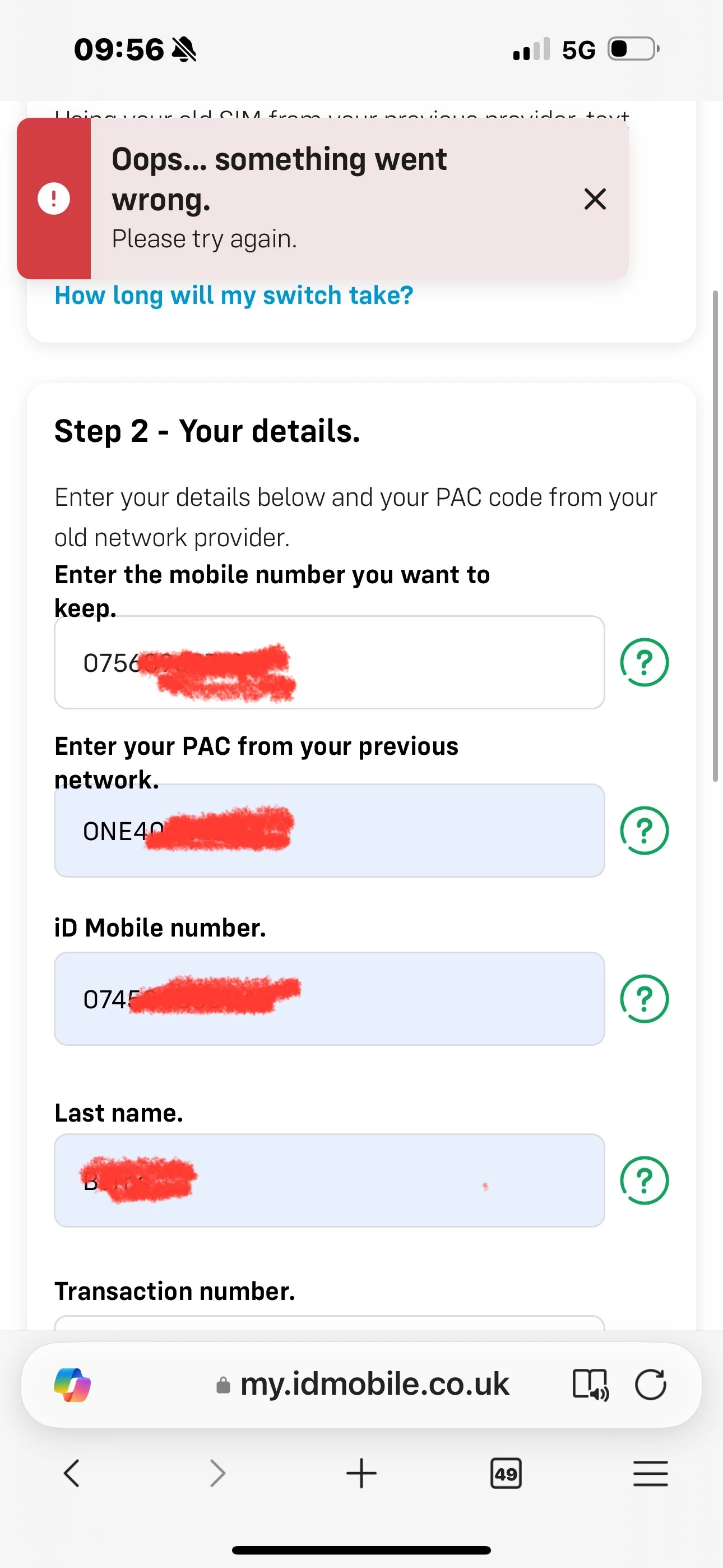 Hi, I’m trying to switch over my mobile number from my mobile ID, I have the correct details but keep getting this error message? I have emailed but not getting a response, so how am I actually supposed to use my new sim if I can’t convert my number over?